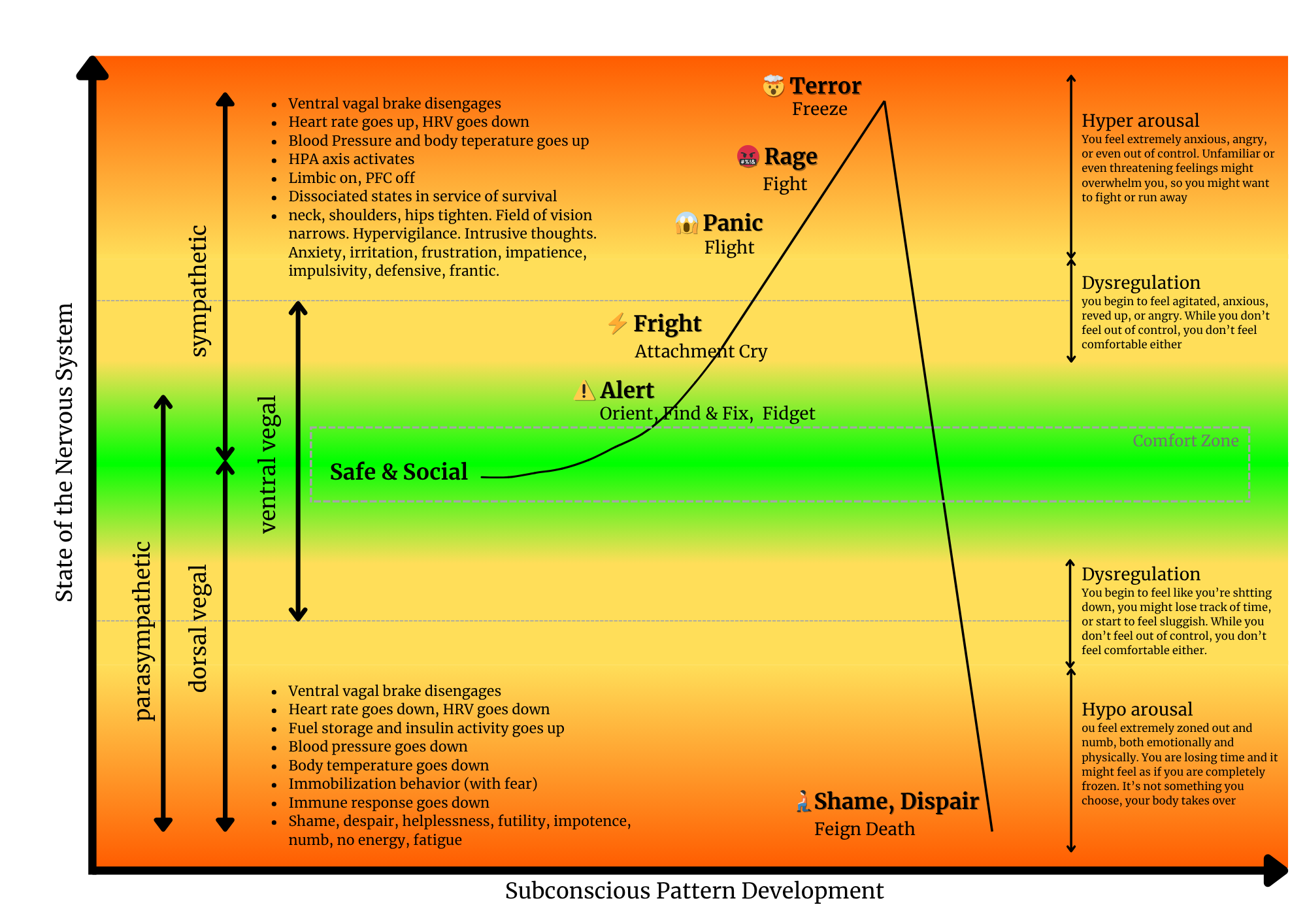 This state is often accompanied by terror, dissociation, or a sense of losing control. Regulation is largely absent. The nervous system is now fully in survival mode.